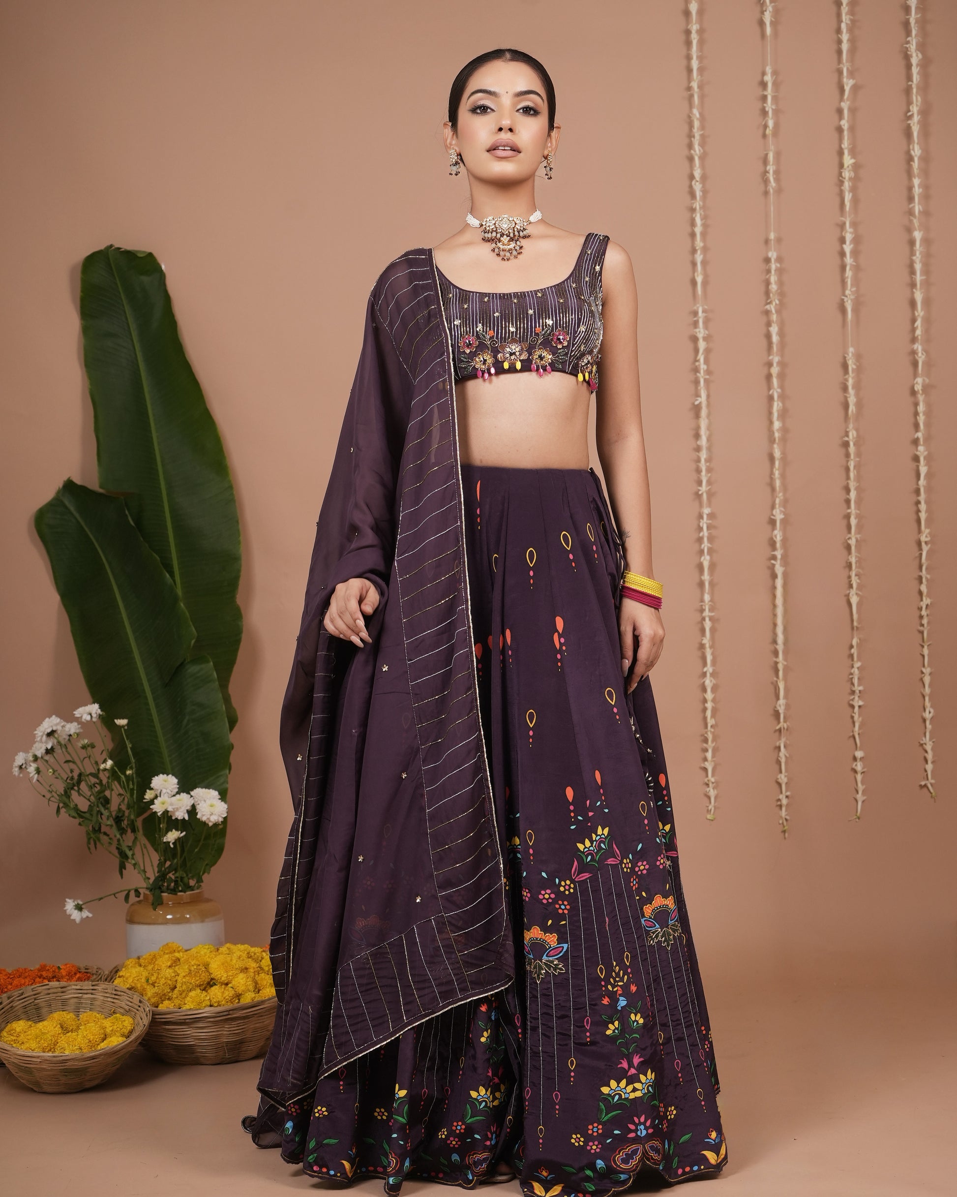 Dark Purple Printed Heavy Lehenga Set (Set of 3)